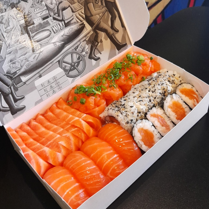 8 sashimi (salmão, salmão roasted ou peixe branco), 4 niguiri salmão, 4 uramaki alaska, 4 hossomaki salmão, 4 gunkan shakenegui. Inclusão opcional de 1 porção de Hot Filadélfia (8 peças) pelo valor promocional de R$19,90.